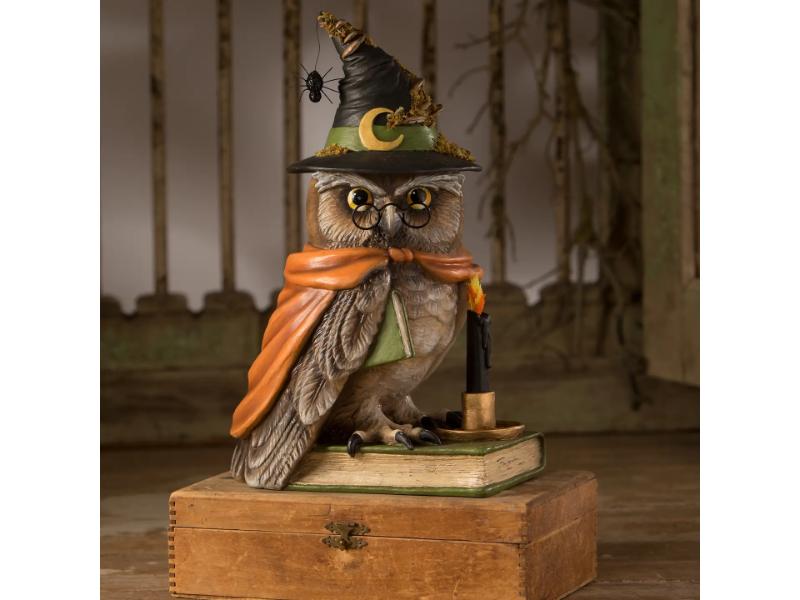 Deep in the woods perched on the tallest tree you will find this woodsy wizard owl. He is waiting to give you all his Halloween wisdom. He stands on top of an aged book and has a faux candle at his feet with a tissue paper flame. This woodsy owl by Bethany Lowe designs is adorned with mushrooms and has a friendly spider hanging from his hat.