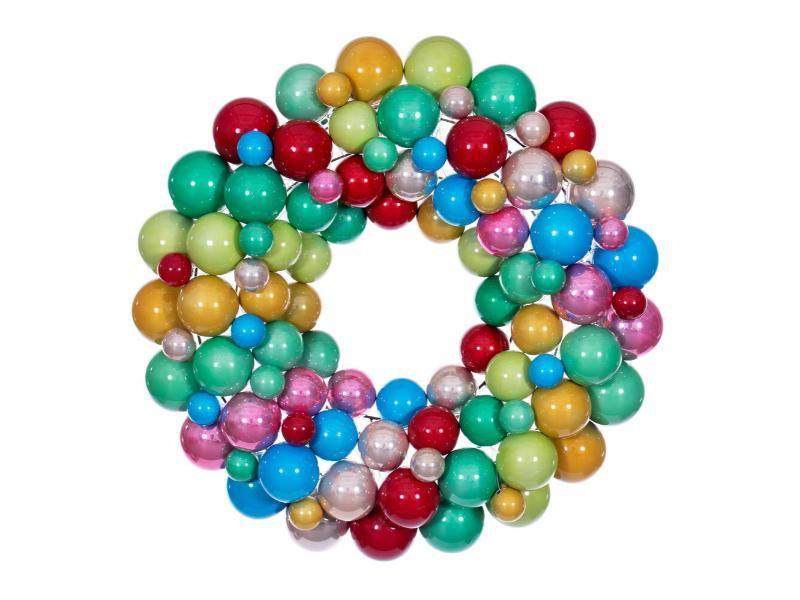 Make a bold and festive statement with this 24-inch ornament wreath, bursting with holiday cheer. It features 93 ornaments in a mixture of 1.5", 2.4", 2.8", and 3.1" sizes. It features a combination of red, rose gold, teal, pink, gold, seafoam green, turquoise, and celadon ornaments in a pearl finish.